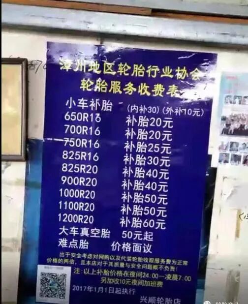 去年1月,辽宁省阜新市彰武县乘用车轮胎及轮胎维修与服务行业联合声明:“由于行业物价上涨,成本升高,当地34家轮胎维修服务点的轮胎修理、动平衡、四轮定位等轮胎相关服务项目有所上涨,乘用车轮胎修补及相关服务费用20元起,各种型号各种规格均有所上涨”。该声明指出:当地的轮胎维修服务业务,十多年没涨过价。