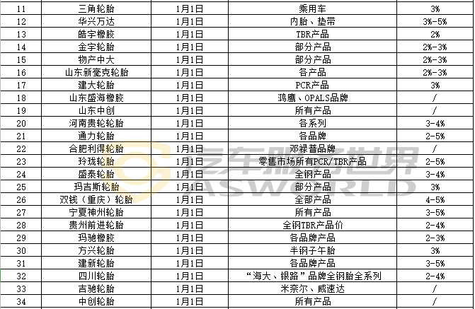 以华安轮胎为例。1月20日,华安轮胎宣布的涨幅是2%-3%,且并不排除在2月1日再次上调出厂价格,相关负责人在接受媒体采访时表示:到3月份预计该公司还会有两轮价格上调。