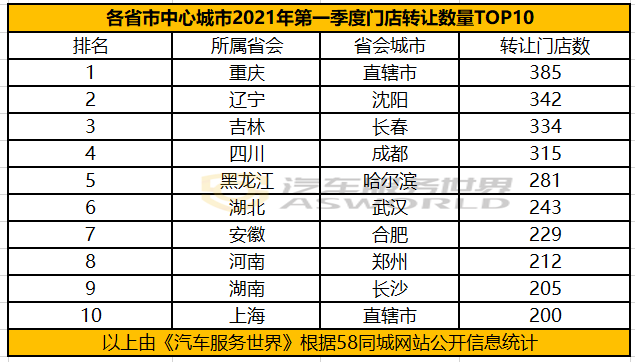 时隔一年之后,《汽车服务世界》再次统计了同一平台2021年第一季度内地31省市自治区中心城市的汽服门店转让状况,发现了以下的事实。