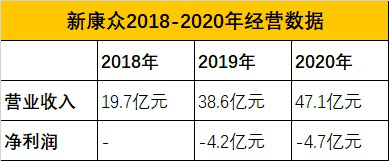 数据显示,2020年新康众营业收入47.1亿元,同比2019年38.6亿元增长22%;净利润-4.7亿元,同比2019年-4.2亿元亏损扩大12%。
