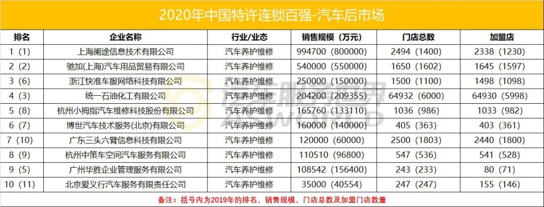 2020年中国特许连锁百强(汽车后市场)基本情况