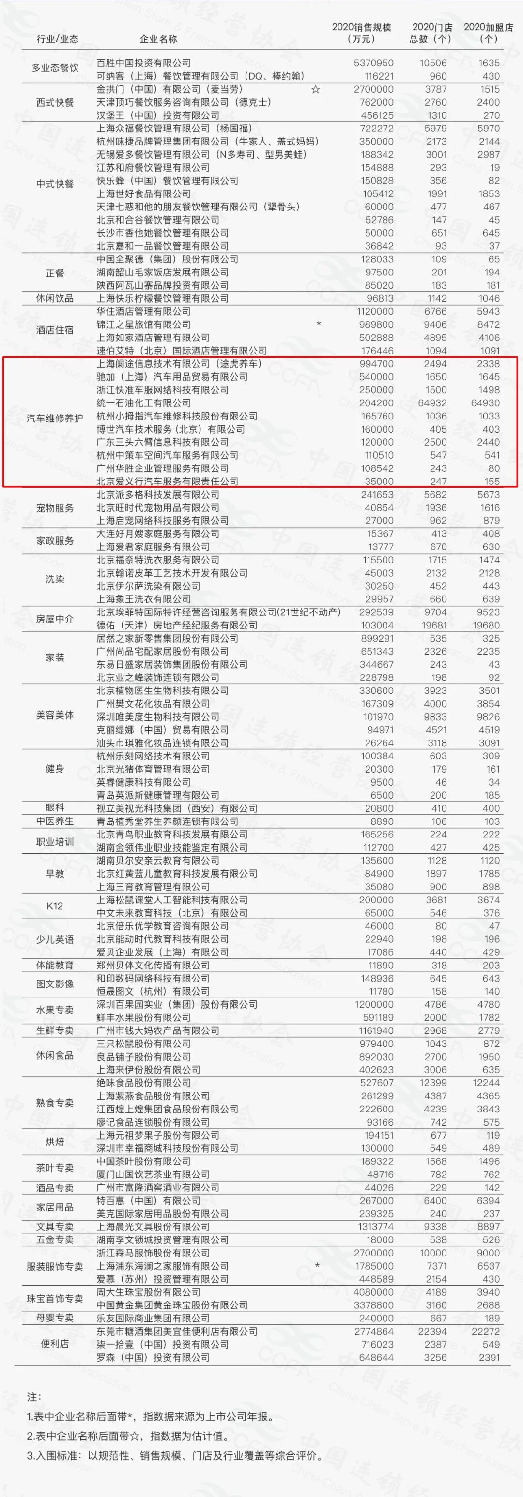 一个是快准车服,销售规模从15亿增长到25亿,门店总数从1100家增长到1500家,排名从第6涨到第3;一个是三头六臂,销售规模从6亿增长到12亿,门店总数从1803家增长到2500家,排名从第10涨到第7。
