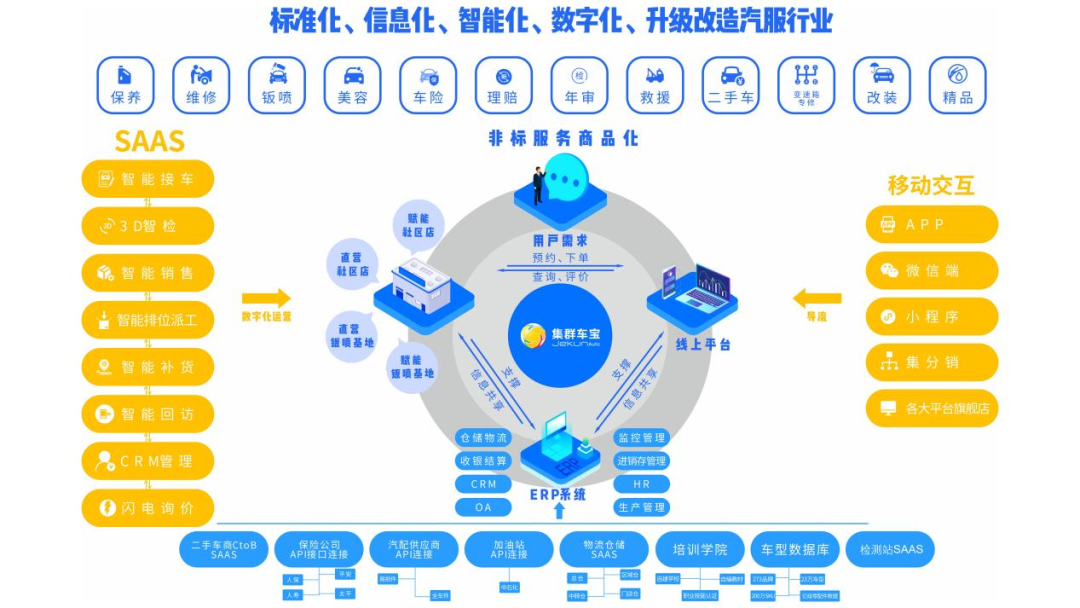 直到2019年,集群车宝再次亮相,宣布融资数千万,打造汽车后市场数字化门店赋能系统,笔者看到了发布会现场集群车宝公布的那张系统架构图,当时十分激动,跟诸多同行好友分享,并且对同行好友说:这就是我理想中完美的汽服门店连锁运营的数字化智能赋能系统。