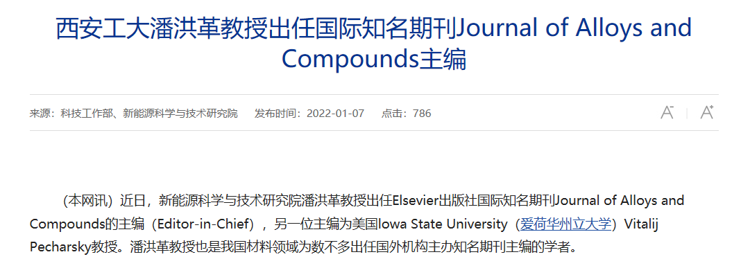 据西安工业大学官网消息,2022年1月7日,西安工业大学发布消息,该校新能源科学与技术研究院潘洪革教授出任《Journal of Alloys and Compounds》主编(Editor-in-Chief)。