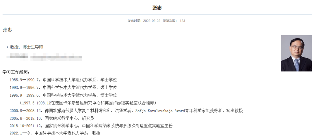 据中国科大近代力学系官网消息, 张忠教授已加盟并列出了网页信息。此前,张忠教授是国家纳米科学中心研究员。