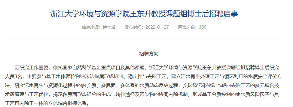 据浙江大学人事处官网消息,王东升教授已在浙大招聘博士后,这意味着,王冬升教授已加盟浙江大学。此前,王东升是中国科学院生态环境研究中心研究员,2010年获得国家杰青项目。
