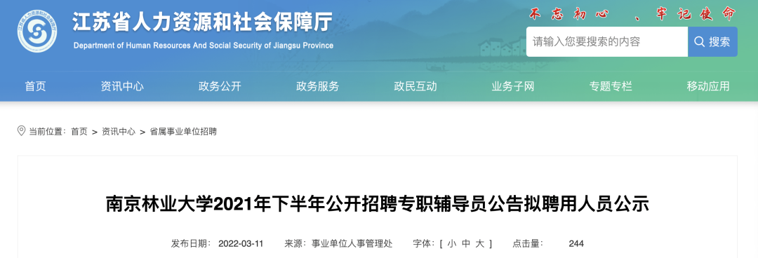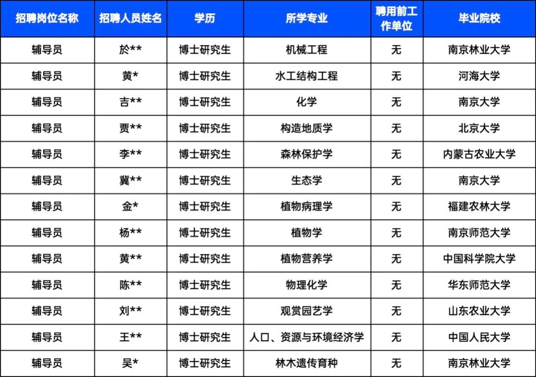 3月11日,江苏省人力资源和社会保障厅公布了《南京林业大学2021年下半年公开招聘专职辅导员公告拟聘用人员公示》,此次共招聘13人,均为博士研究生。