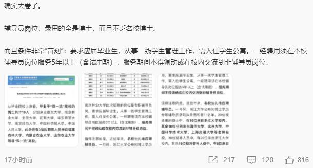网友评论:确实太卷了。辅导员岗位,录用的全是博士,而且不乏名校博士。而且条件非常“苛刻”:要求应届毕业生,从事一线学生管理工作,需入住学生公寓。一经聘用须在本校辅导员岗位服务5年以上(含试用期),服务期间不得调动或在校内交流到非辅导员岗位。
