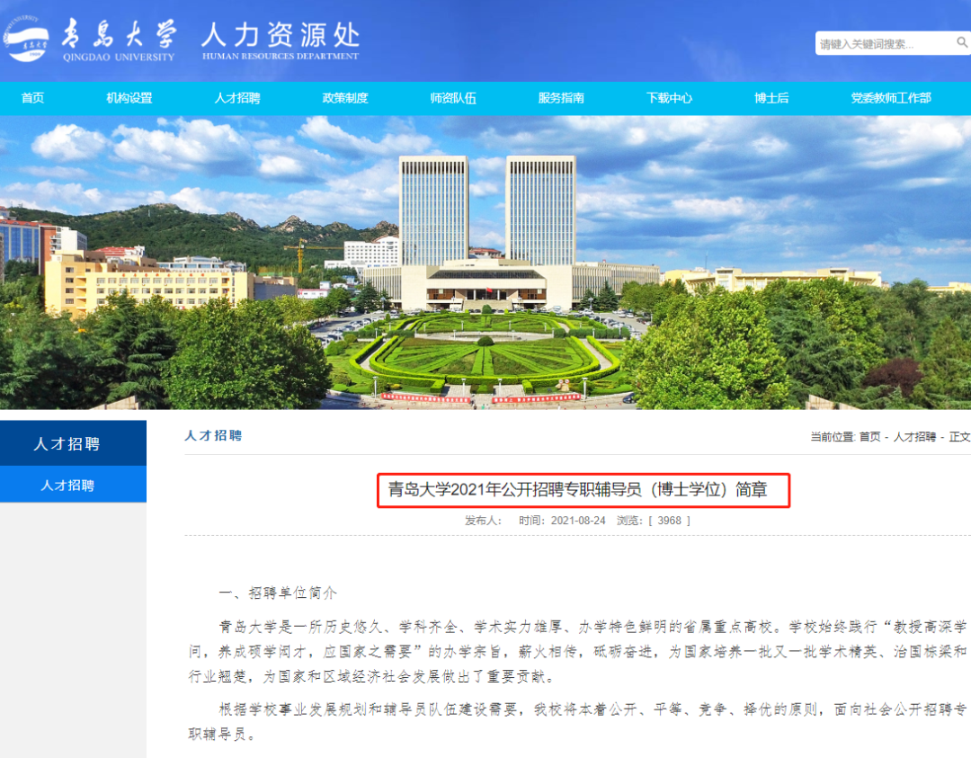 2021年8月,青岛大学发布了一则“2021年公开招聘专职辅导员(博士学位)简章”,从招聘公告的标题就能看出,拥有博士学位是申请辅导员的必要条件。