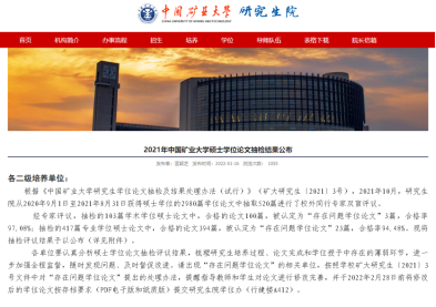今年1月16日,中国矿业大学公布了2021年硕士学位论文抽检结果。研究生院从2980篇硕士学位论文中抽取了520篇进行校外同行专家双盲评议,学术学位硕士论文中3篇被认定为“存在问题学位论文”,专业学位硕士论文中有23篇被认定为“存在问题学位论文”。