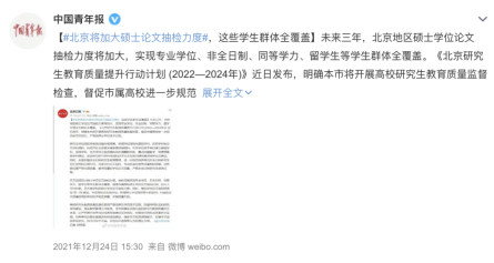 2021年12月,北京市教印发《北京研究生教育质量提升行动计划(2022-2024年)》,加大北京地区硕士论文抽检力度,所有学生群体全覆盖。