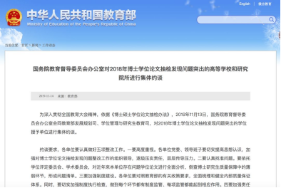 2019年11月13日,国务院教育督导委员会根据《博士硕士学位论文抽检办法》,对2018年博士学位论文抽检发现问题突出的学位授予单位进行集体约谈。