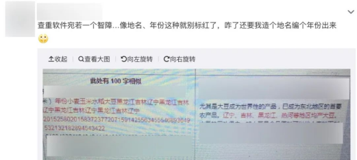 今年有很多同学吐槽,因为降重,毕业之路更加艰辛了。“半殖民地半封建”改为“零点五殖民地零点五封建”、“小球旋转一周”改为“小球旋转一星期”等啼笑皆非的事情时有发生。