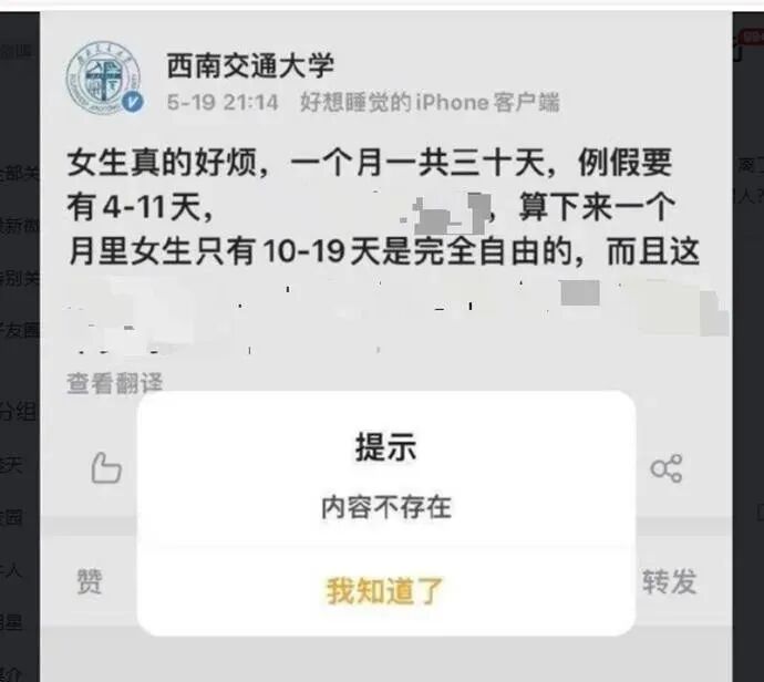 5月19日晚,西南交通大学官方微博上发布了一段以“女生真的好烦”为开头的言论,随后迅速被删除。