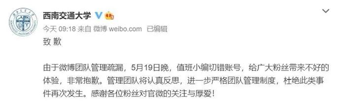5月20日上午,该校在微博上发布致歉声明。西南交通大学工作人员表示,此事是工作人员切错号导致的工作事故。