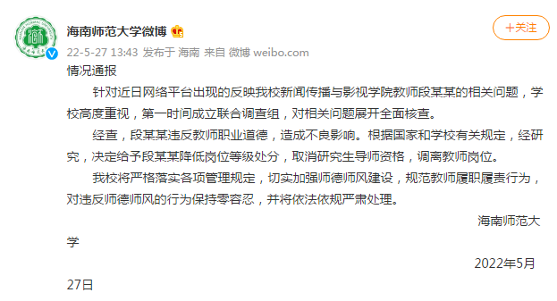 5月27日,海南师范大学发布最新通报。其中提及校方决定给予段某某降低岗位等级处分,取消研究生导师资格,调离教师岗位。