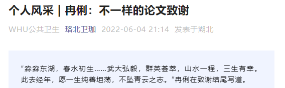 六月将至,全国各地高校迎来了毕业季,武汉大学公共卫生学院劳动卫生与环境卫生学专业2022届博士毕业生冉俐同学用文言写就了一篇毕业论文致谢,令人印象深刻。其导师谭晓东教授评价道,“不仅SCI 写得好,其国学功底也同样非凡。”