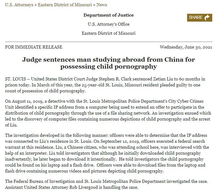 根据美国密苏里州圣路易斯(St. Louis)联邦检察官办公室30日发布的消息,今年3月,25岁的前华盛顿大学研究生刘泽天(Zetian Liu音译)因持有儿童色情文件被检方起诉并认罪,于6月30日被判处60个月(5年)监禁。