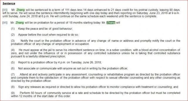 考虑到张某的留学生身份,法官从宽处理他的案子,允许他每周坐牢三天。刑满释放后,他被遣返回中国。