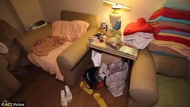 卧室的地板上散落着塑料袋,家具上散落着床单。