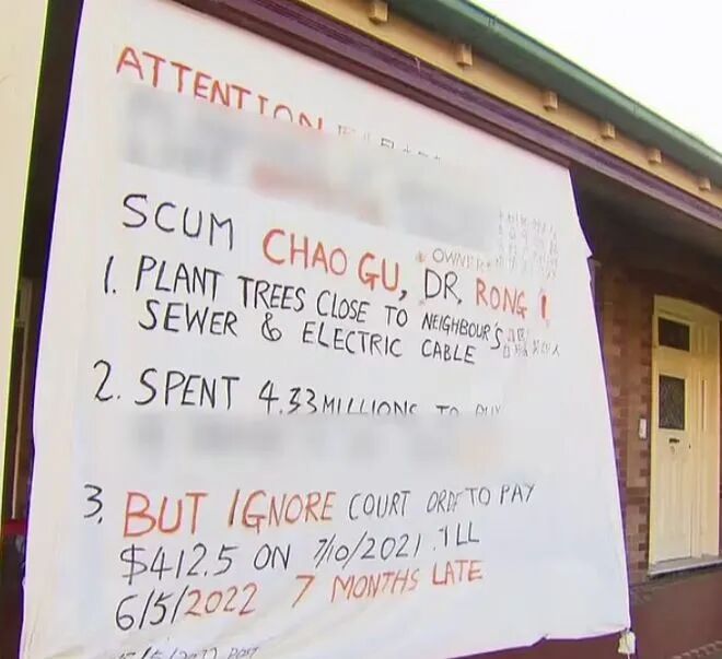 前不久的时候,这位华人大妈突然又心血来潮,用床单写下了对于邻居Ji博士的控诉,还把床单挂在了院子外示众。