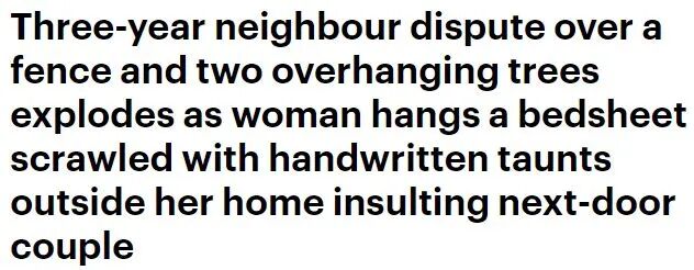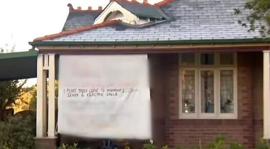 床单上是这样写的:“注意这对可耻的夫妇,他们在邻居家的下水道和电缆附近种树。