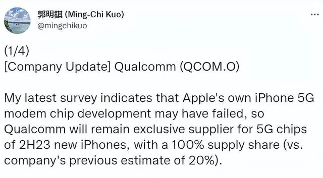 没有对比就没有伤害,6月29日,天风国际分析师郭明錤发推称,“最新的调查表明,苹果5G芯片开发已经失败”,2023年发布的iPhone将全部采用高通生产的调制解调器芯片。