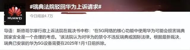 最主要的是,瑞典法院已经正式对外宣布禁止使用华为5G等设备并不违法,甚至还要求当地拆除华为5G等设备,并在2025年之前完成。