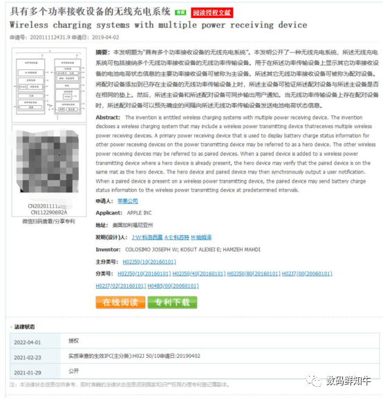 4月6日,最新消息,苹果Apple公司获得了一项新专利的授权,状态更新日期为4月1日。这项专利技术的名称为“具有多个功率接收设备的无线充电系统”。