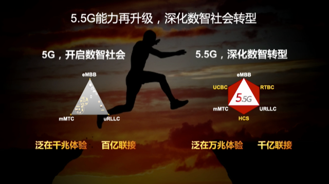 5.5G 在传统的通信方面将带来能力的巨大跃升,支持下行 10Gbps、上行 1Gbps、宽带实时交互、千亿物联等超级联接的能力,使能未来虚拟世界、数字孪生和人机协同等核心场景。