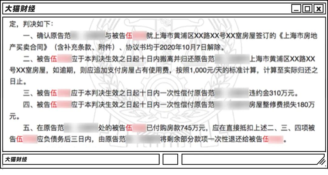 最终,经过一审和二审,法院判伍女士败诉,判赔违约金310万,房屋装修损失180万,而且还需要支付7.3万的案件受理费,10日内搬离房屋,如果不搬,1000元/天的违约金等着呢。