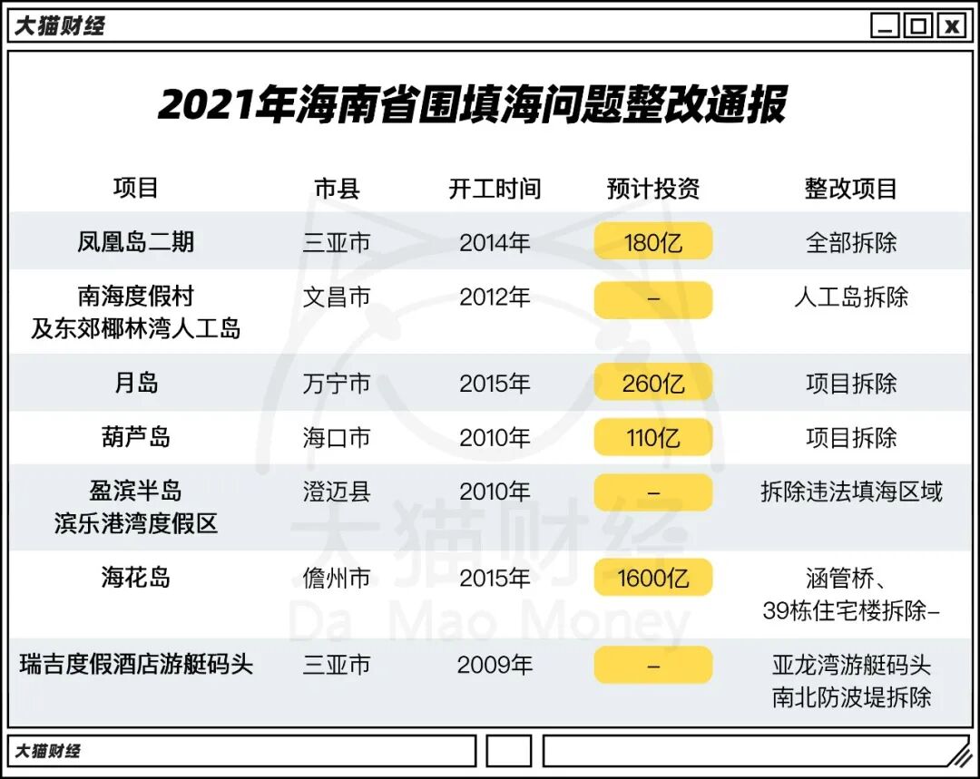 结果也简洁明了,位于三亚预计投资180亿的凤凰岛二期,拆除,位于万宁投资260亿的月岛,拆除……
