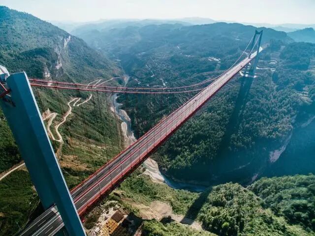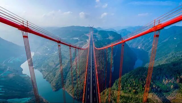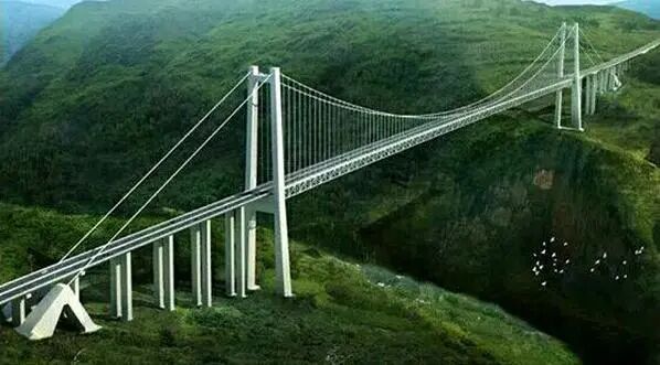 印度人所说的这座桥就是我国第二高大桥—清水河大桥。位于贵州省,这座大桥可厉害了,是建筑在两岸之间,这座大桥的中间可以说是个悬崖,同时也是个深不可见的河流。而最让我们惊呆的是这座大桥竟然是用很多绳子固定起来的(其实是钢索)。