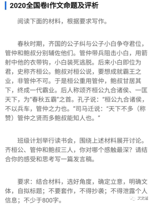 去年高考全国卷的作文题目是一个讨论型的话题。主要是结合齐桓公、鲍叔牙和管仲之间的故事进行讨论。