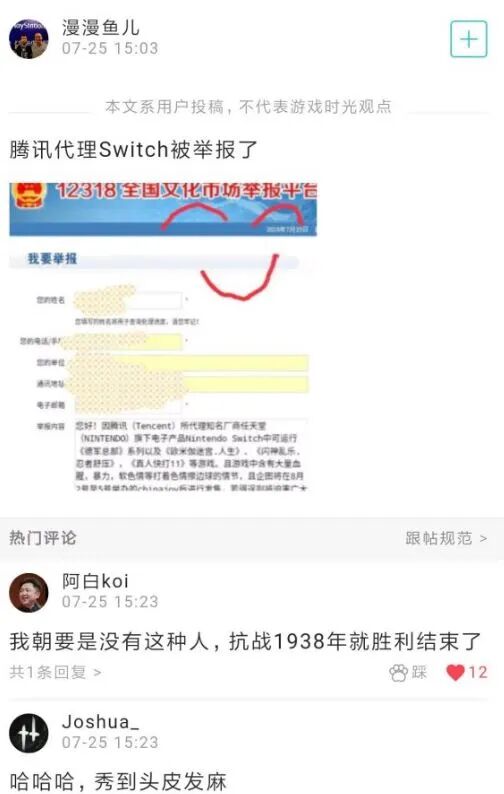 2019年7月,腾讯代理任天堂Switch消息一出,就有玩家对国行NS进行了举报。