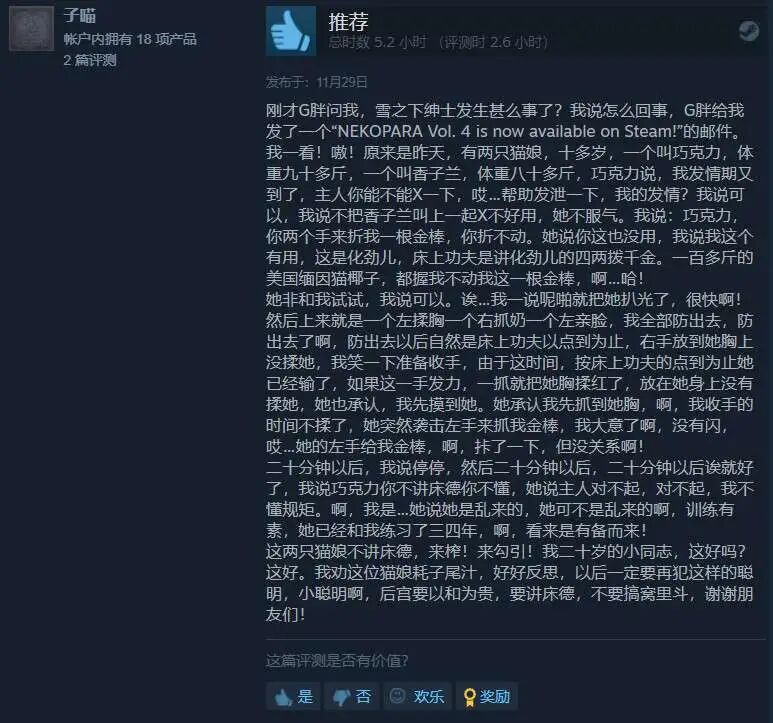 但只要《巧克力与香子兰》继续在国区Steam上存在着,就永远会有数不尽的慕名而来者,争相为游戏打出好评。