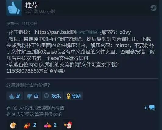 依照往常的评测惯例,评测区最有价值的评论,一定是游戏的补丁链接。熟悉这款游戏的玩家都知道,只有打上评测区的补丁,游戏才会进化成为真正的完全体。所以在每次新作发布后,玩家除了第一时间购买游戏外,另一件必做的事,就是以最快的速度前往评测区,下载最新的游戏补丁。