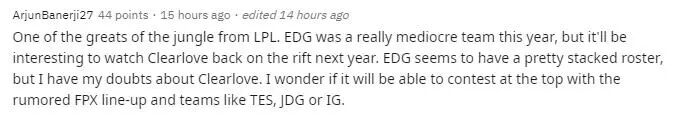 国外许多网友也是这个看法,“他是LPL打野里最伟大的选手之一。今年的EDG是一个非常平庸的队伍,但是明年可以看到厂长回归赛场。EDG似乎很多选手,但我对厂长表示怀疑。我想知道它是否能与传闻中的FPX、以及TES、JDG或者IG这样的队伍竞争。”
