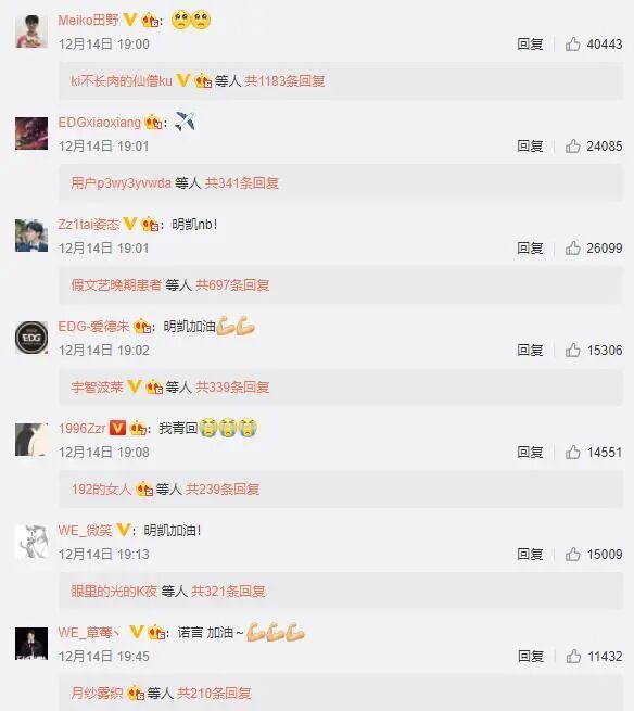 在厂长的个人微博下方,许多圈内好友也纷纷献上了祝福,被许多人从小看到大的辅助选手Meiko以两个泪目的表情抢到了沙发位置,而曾经WE的队友微笑、草莓也纷纷献上了祝福,对于许多LPL老观众来说,这次真的是爷青回了。