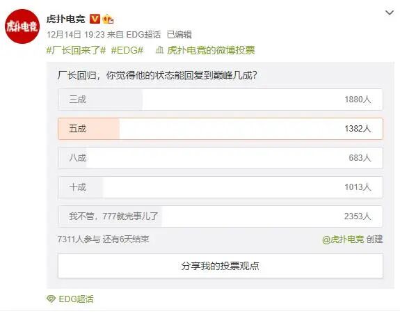 不过理想很丰满,现实很骨感,虽然在评论区里都是对厂长的溢美之词,但是许多人也对离开赛场很久,年龄高达27岁的厂长目前的竞技水平表示担忧,在微博上有网友发起投票“厂长回归后他的状态可以回复到巅峰时期的几成”,虽然大部分网友选择了比较戏谑的“我不管,777就完事了”,但是选的第二多的网友还是选择了“三成”,可以看出很多人并不看好厂长的复出可以对队伍战力的提升有多大的帮助。