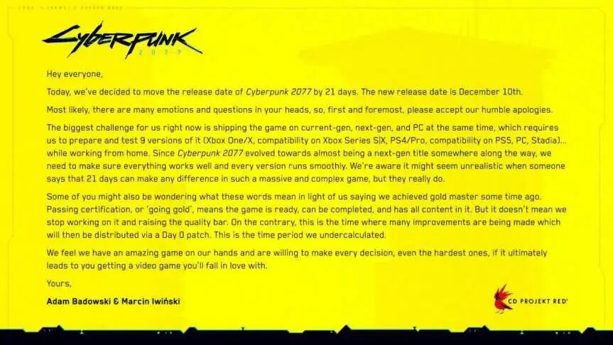 再往前追溯到10月28日,CDPR宣布《赛博朋克2077》跳票的“黄图”公告刷爆网络,引发了大量围观群众争相玩黄图梗。而CDPR给出的延期理由,则是为了完善次世代版游戏实机表现。CDPR自然深知《赛博朋克2077》的真实品质,但漫长的开发周期,已经让它没法再拖下去了。