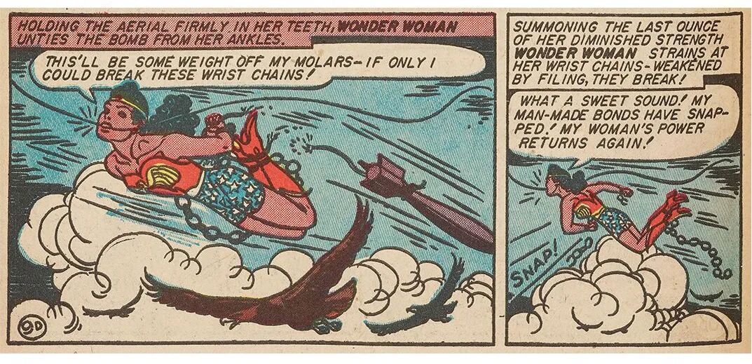 在创作中,马斯顿似乎是一个对自己的“性癖”从不遮遮掩掩的人。据说,最早“神奇女侠”的衣着设计灵感,就来自于奥利弗的情趣内衣形象。在早期的《神奇女侠》漫画作品中,“捆绑”与“被捆绑”,更视为一种不可或缺的重要元素,穿插在每一期故事当中,而作为最重要的“捆绑”道具,那条能让人身体变“诚实”的“真言套索”,也充满了说不出的“情趣”意味。