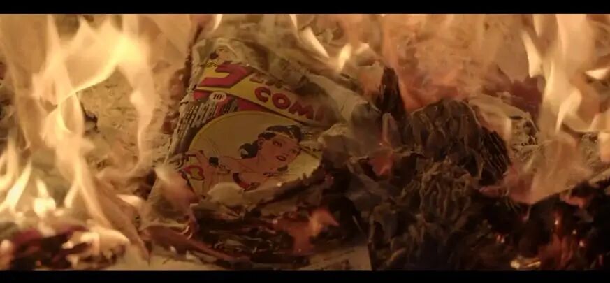 大人、小孩,人群嬉笑着把收集来的漫画书堆放在一起,点燃火把,大喊着“烧掉!烧掉!”他们手舞足蹈,扭曲而狰狞。