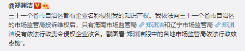 郑渊洁甚至统计了全国三十一个省市自治区,对自己投诉维权的态度,结果大多数省市的市场监管部门责令侵权企业改名,只有海南和辽宁没有搭理。