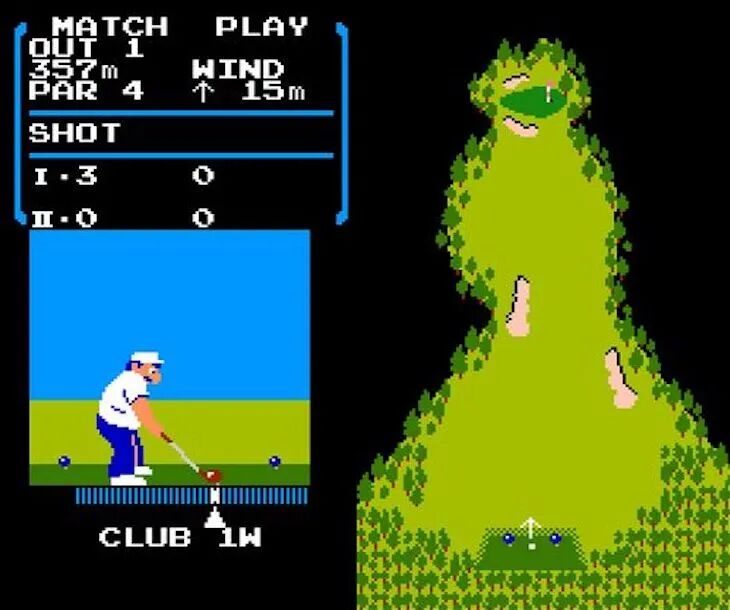 如果说这时的游戏,已经开始拥有了成熟的“行为模拟”,与足够的画面表现力,那么1984年FC主机上的游戏《高尔夫》,则是真正赋予了高尔夫游戏“趣味”。动作自然的击球手、环境多变的赛场、双视点并存所带来的代入与策略感,无不给玩家带来了最好的游戏体验。