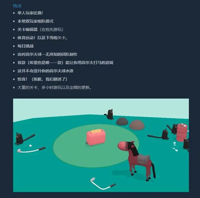 在Steam商店界面的游戏介绍栏中,制作组就直接表明,这是一款为“讨厌高尔夫”的玩家们所制作的游戏,而他们自己,也对高尔夫球的规则一无所知(尽管我不相信)。