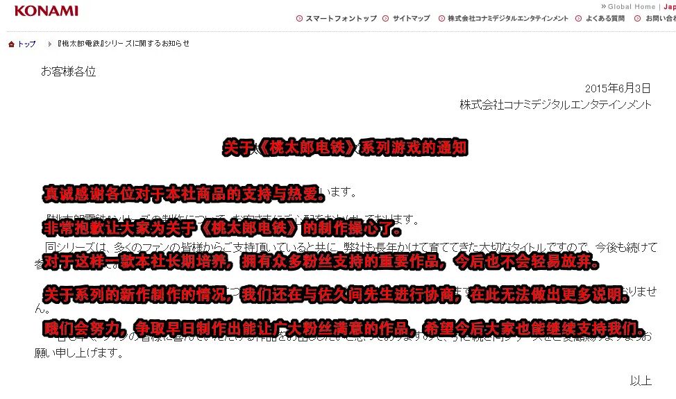 在这样的情况下,佐久间又一次发推表示,“KONAMI方面没有就游戏开发与他联系,桃铁系列可以正式结束了。”