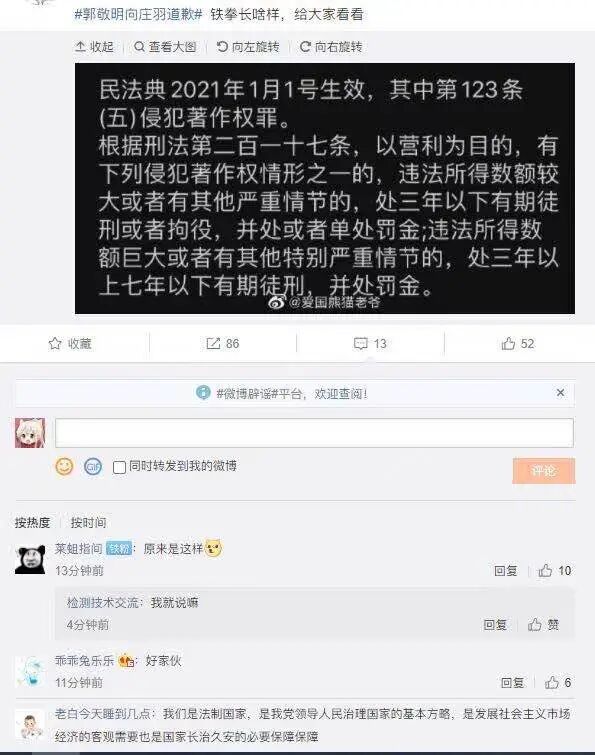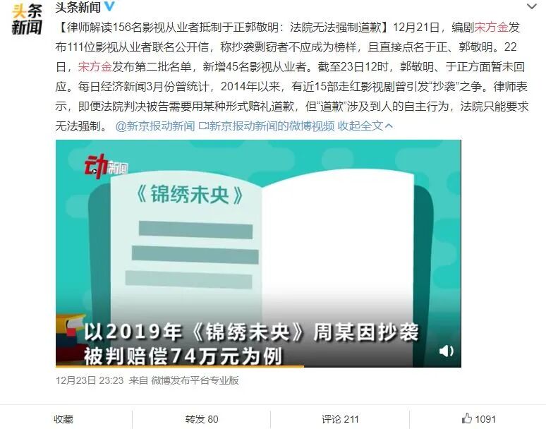 同时,网上亦有声音指出,因2021年1月1日后,《民法典》或会对侵犯著作权罪作出修订,因此郭敬明、于正才急于道歉。