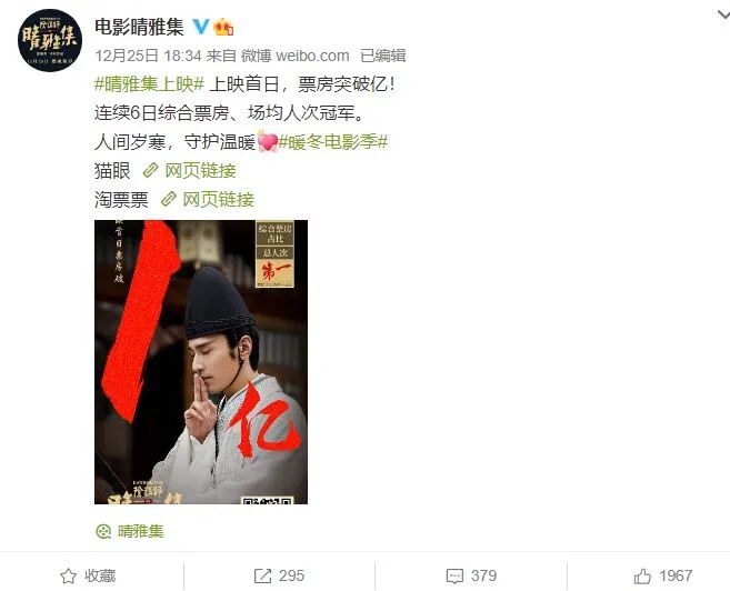 《晴雅集》是郭敬明四年磨一剑之作。上映首日,《晴雅集》的当日票房甚至一度超过了《拆弹专家2》,累积票房轻松突破1亿,上座率和场均人次均为当日第一。
