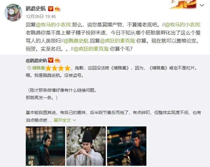 而如今,史航因为夸赞了《晴雅集》,再一次陷入骂战的漩涡。只是现在骂他的,不再是郭敬明的粉丝。